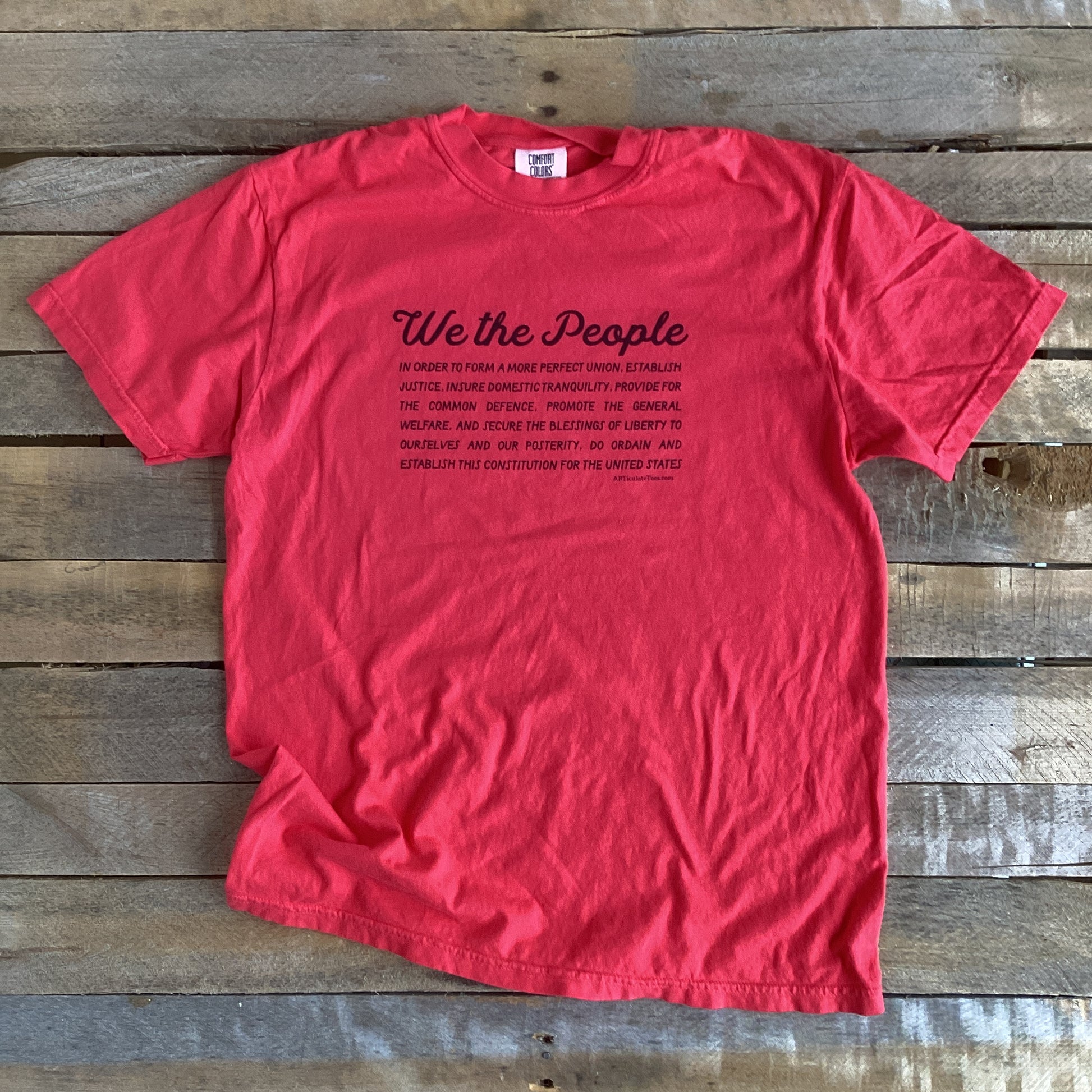 Printed with charcoal colored, water-based pigment ink on a crimson red (muted tone) or paprika (bright slightly pinky/red) t-shirt. Water-based pigment ink bonds to the fibers of the tee, leaving a soft hand.